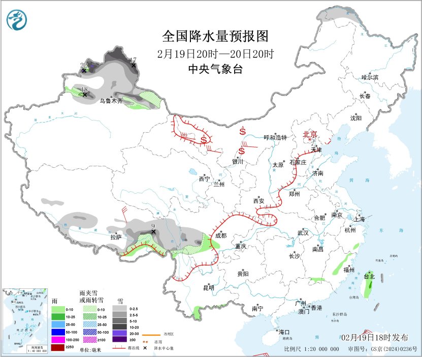 图3 全国降水量预报图(2月19日20时-20日20时)