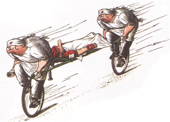 在没有急救车的特殊状况下,急诊医生各踏一辆单轮车,手抬担架转运病人,这种争分夺秒的敬业精神与大爱何其感人。